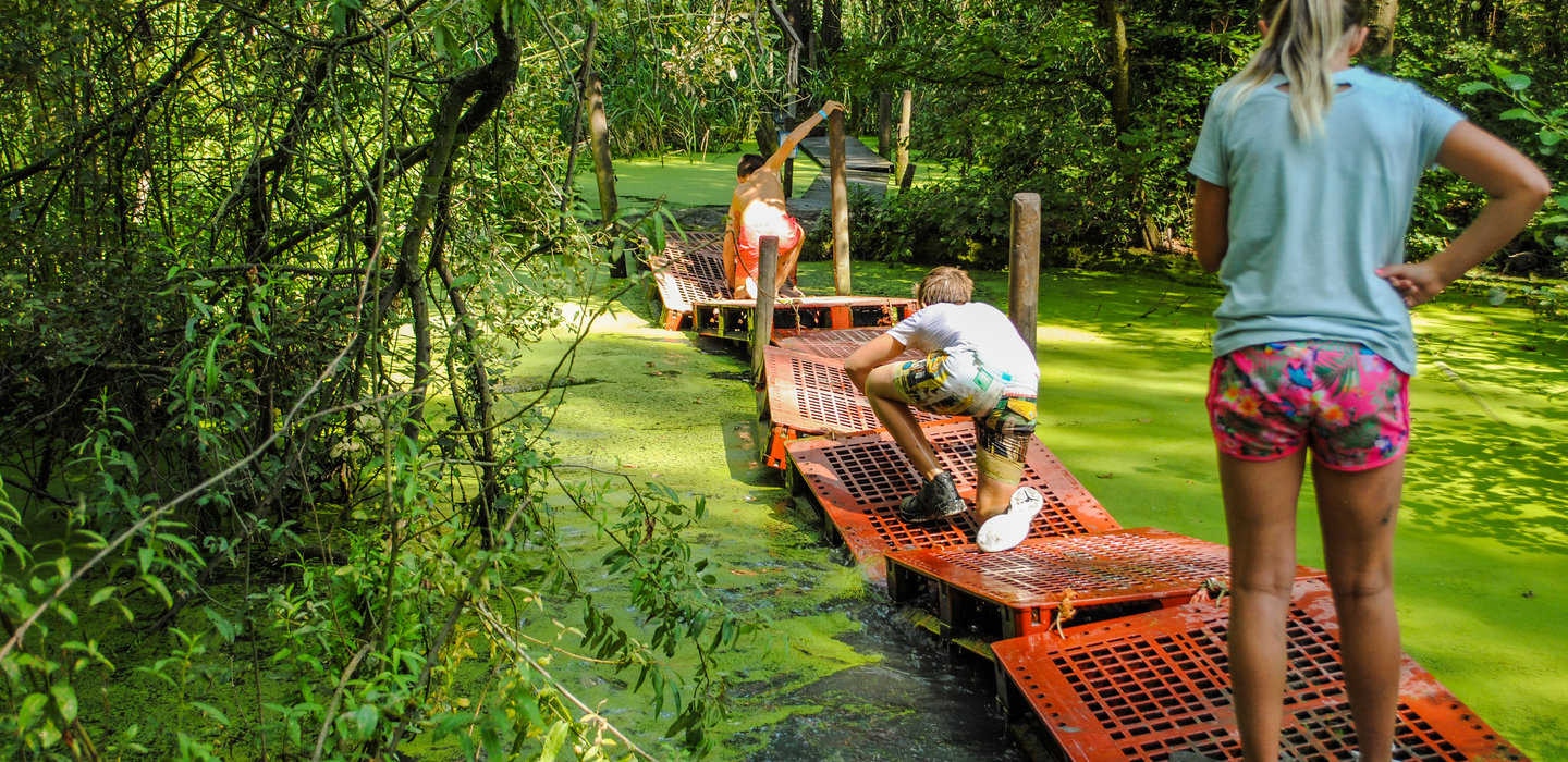De allerkleinsten kunnen hier hun eerste avontuur beleven op een pedalo of het blotevoetenpad, terwijl waaghalzen hier kunnen bengelen op het hoogteparcours of slingeren door het moeras.