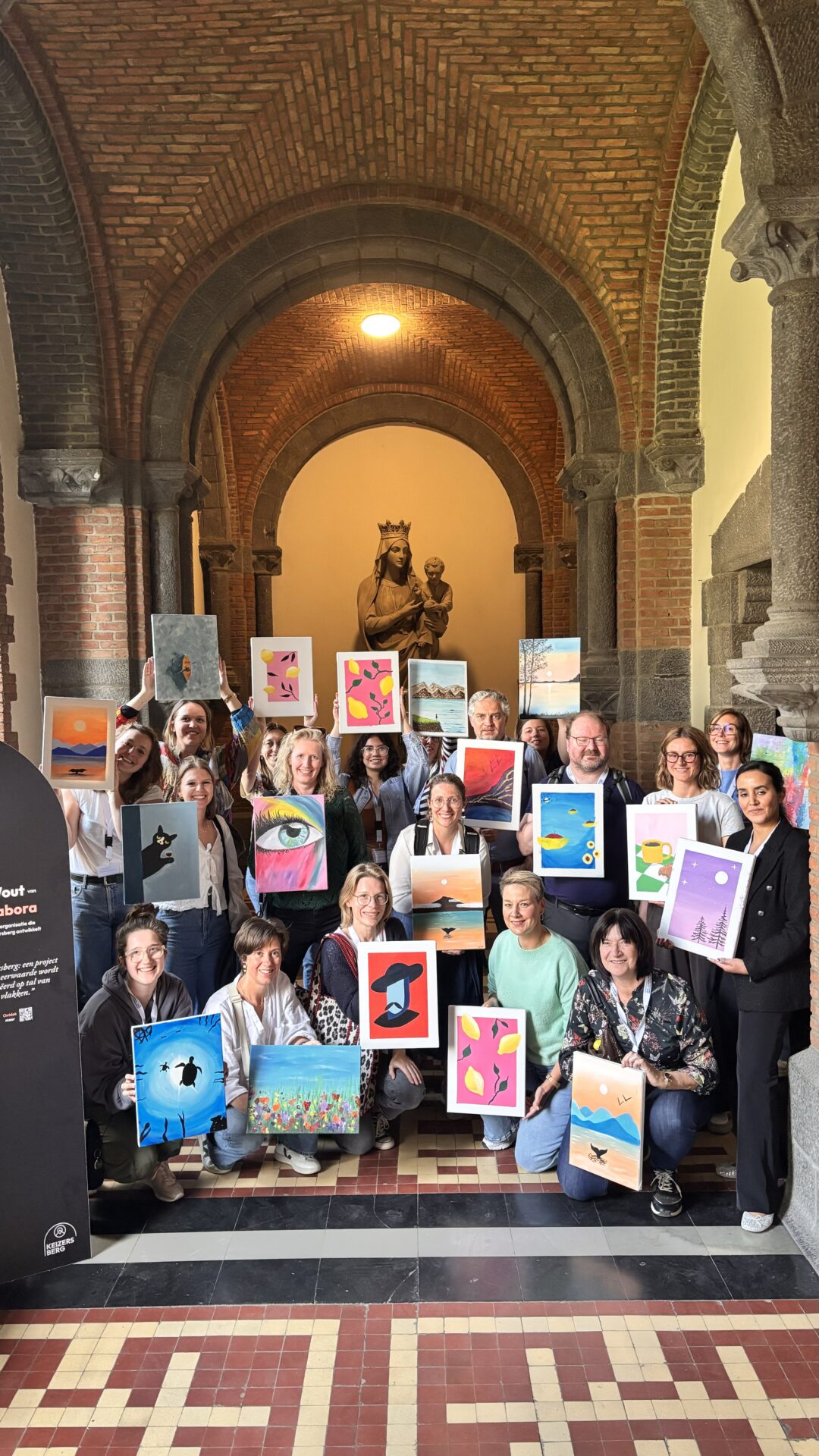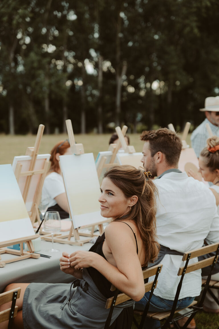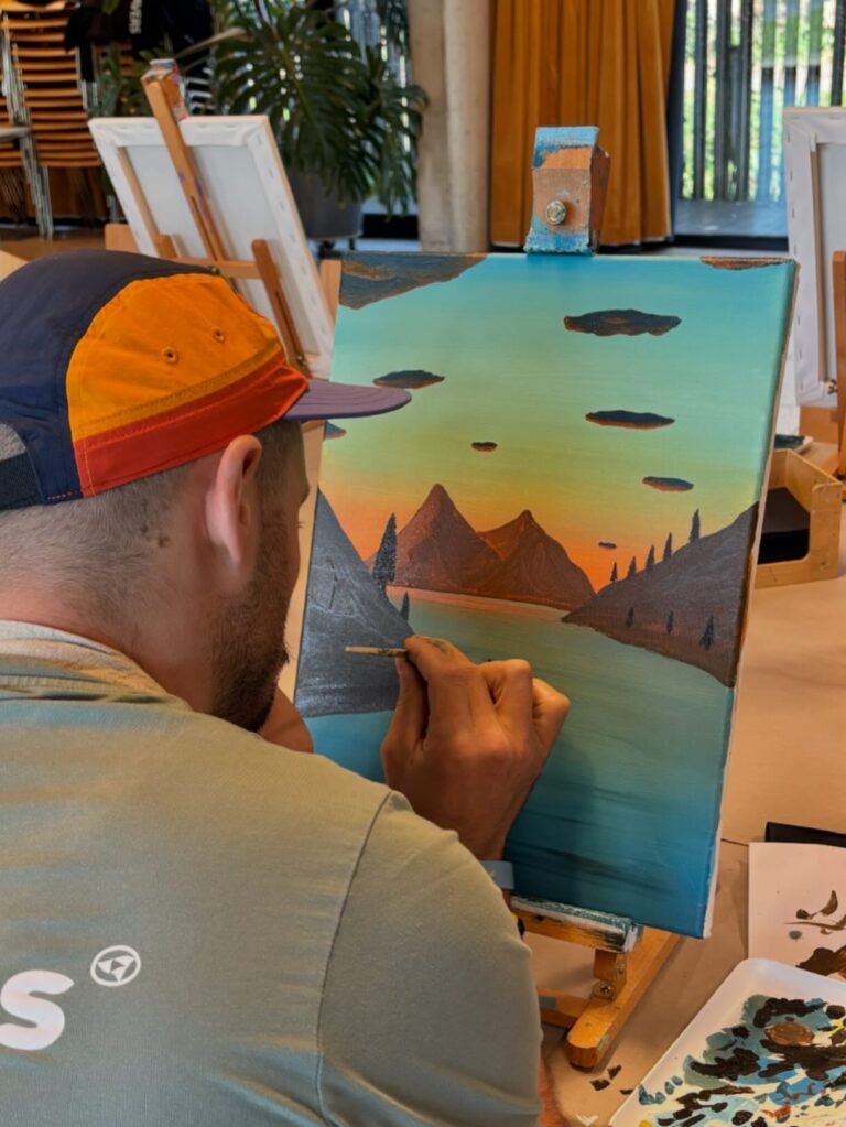 De Paint & Sip Puzzel tilt samenwerking naar een hoger niveau. Elk teamlid schildert een deel van het geheel, maar pas samen vormen de doeken één groot kunstwerk. Denk aan een bedrijfslogo, slogan of visueel thema dat nadien een plek krijgt op kantoor. Deze formule draait volledig rond afstemming, overleg en creativiteit, met een blijvend resultaat dat elke dag aan deze teambuilding herinnert.