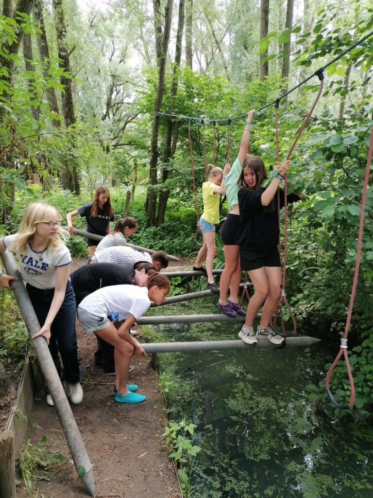 Tijd om de hoogte op te zoeken. Tussen de boomtoppen leren de leerlingen hun eigen grenzen kennen. We sluiten af met actie boven het water. Elkaar naar de overkant schreeuwen en fysieke uithouding testen: dé manier om de banden aan te halen.