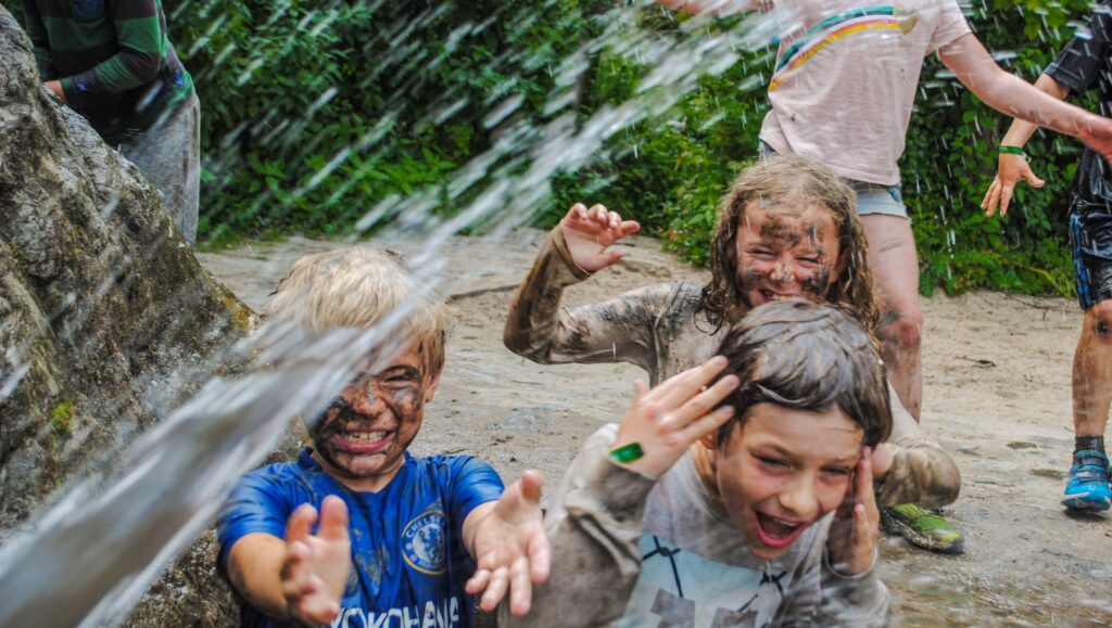 Klaar voor een streepje modder? We zoeken de wand op voor een verticale klimtocht langs kabels. De beloning? Een spectaculaire deathride boven het domein. We sluiten de ochtend af met energieke groepsestafettes.