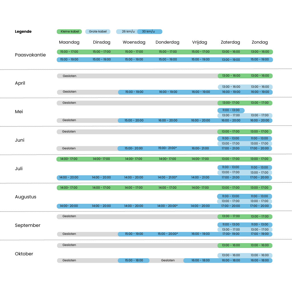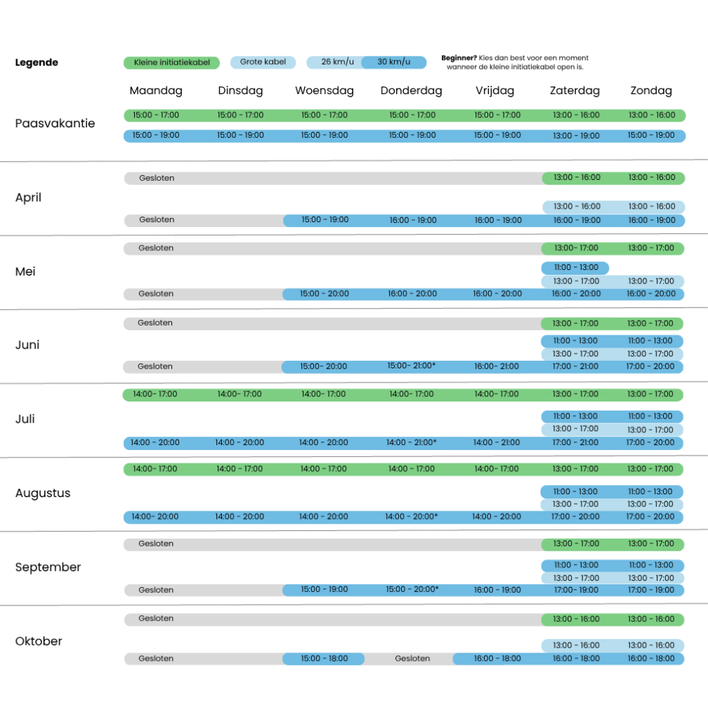 Vanaf het eerste weekend van april vliegen we er weer helemaal in! Zet het alvast in je agenda en tel samen met ons af naar de start van ons cableparkseizoen.