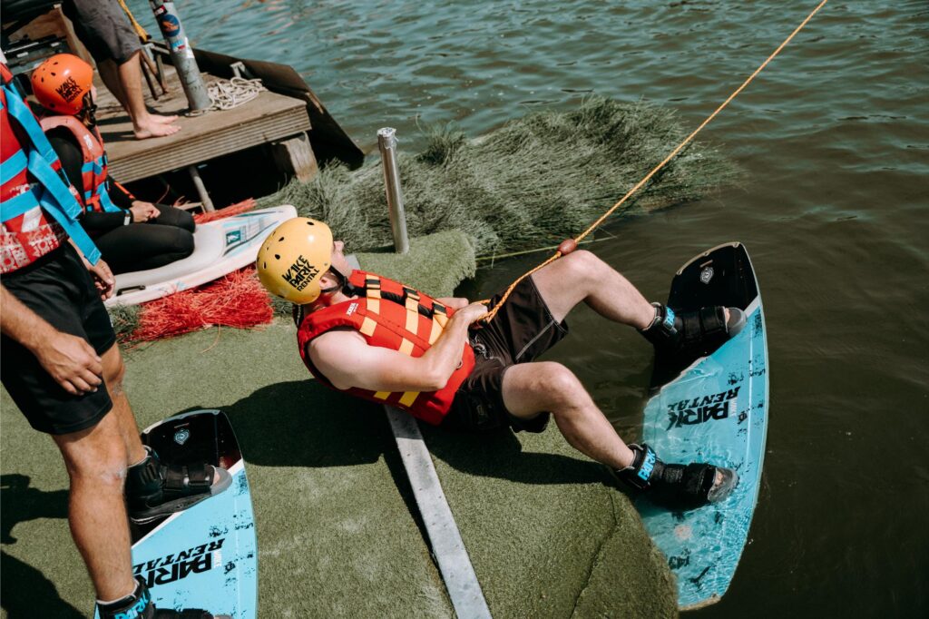 De logische volgorde is eerst kneeboarden, vervolgens waterskiën, en als laatste wakeboarden. Dit is de moeilijkste stap. Ervaring met snowboard, kite of skateboarden kan wel helpen bij het leren wakeboarden. Als je wil proberen wakeboarden voor de eerste keer, dan kies je voor een wakeboard easy-up. Pas als het lukt om rondjes te varen met de easy-up, kan je overschakelen naar een obstacle wakeboard. Je kan deze materialen ook steeds aan het onthaal bij huren. Vraag gerust raad bij een medewerker.
