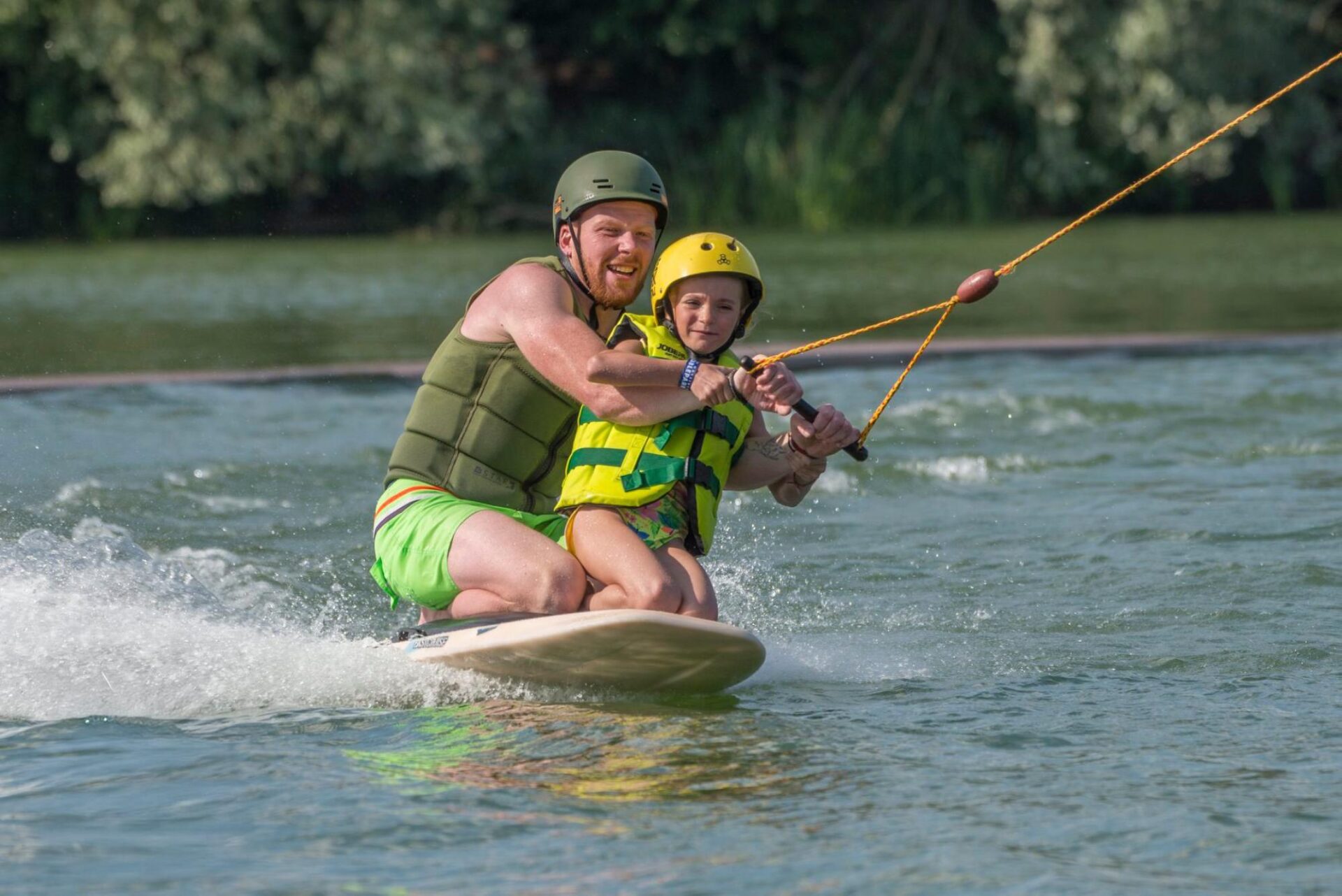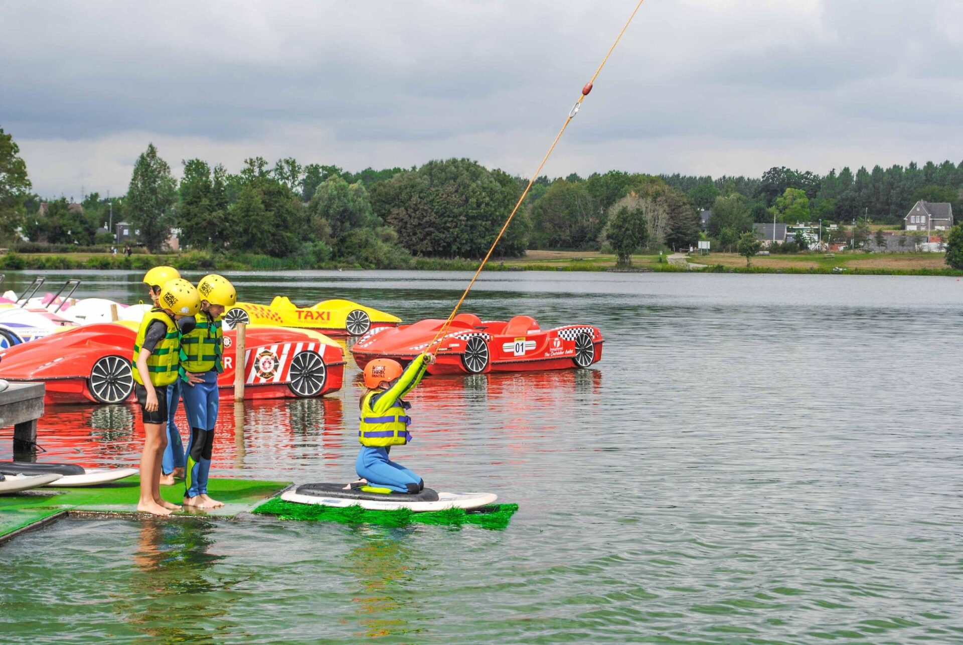 Naast de toegang aan de grote kabel, zijn ook helm, reddingsvest, kneeboard en waterski’s inbegrepen in de prijs. Indien de kleine kabelbaan ook open is tijdens jouw sessie, heb je hier automatisch ook toegang tot.