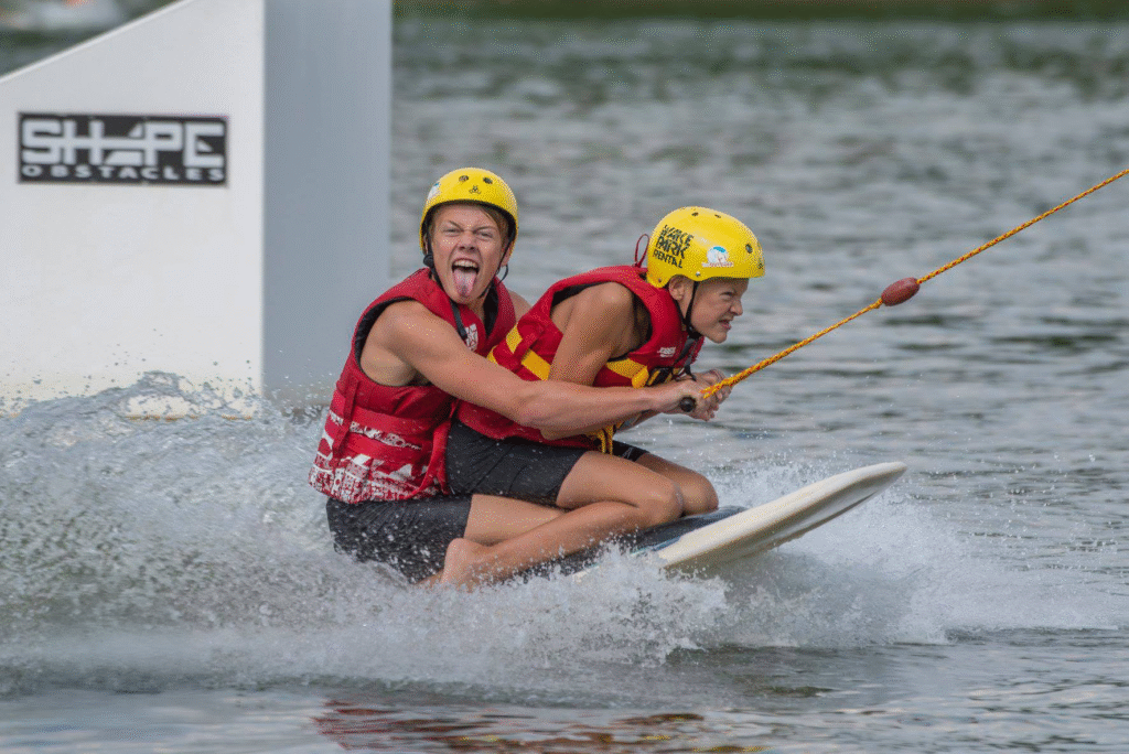 Met twee aparte kabelbanen kies je zelf hoe je het water op gaat: laagdrempelig starten op de kleine kabel of voluit knallen op de grote kabel met bochten en obstakels. Zo leer je op je eigen tempo bij, zonder stress of gedrum, en groeit elke sessie vanzelf uit tot een volgende stap.